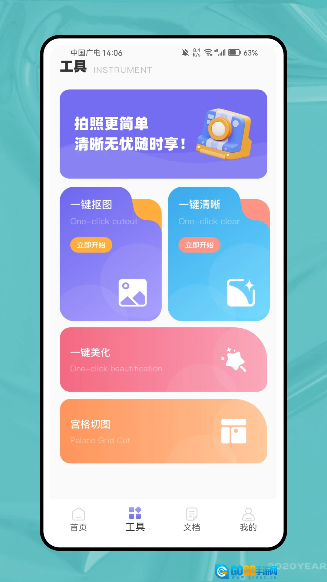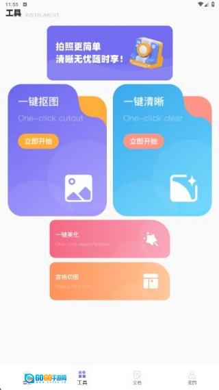 2、工具页面呈现了图片处理相关功能,包含一键抠图、一键清晰、一键美化、宫格切图等板块。