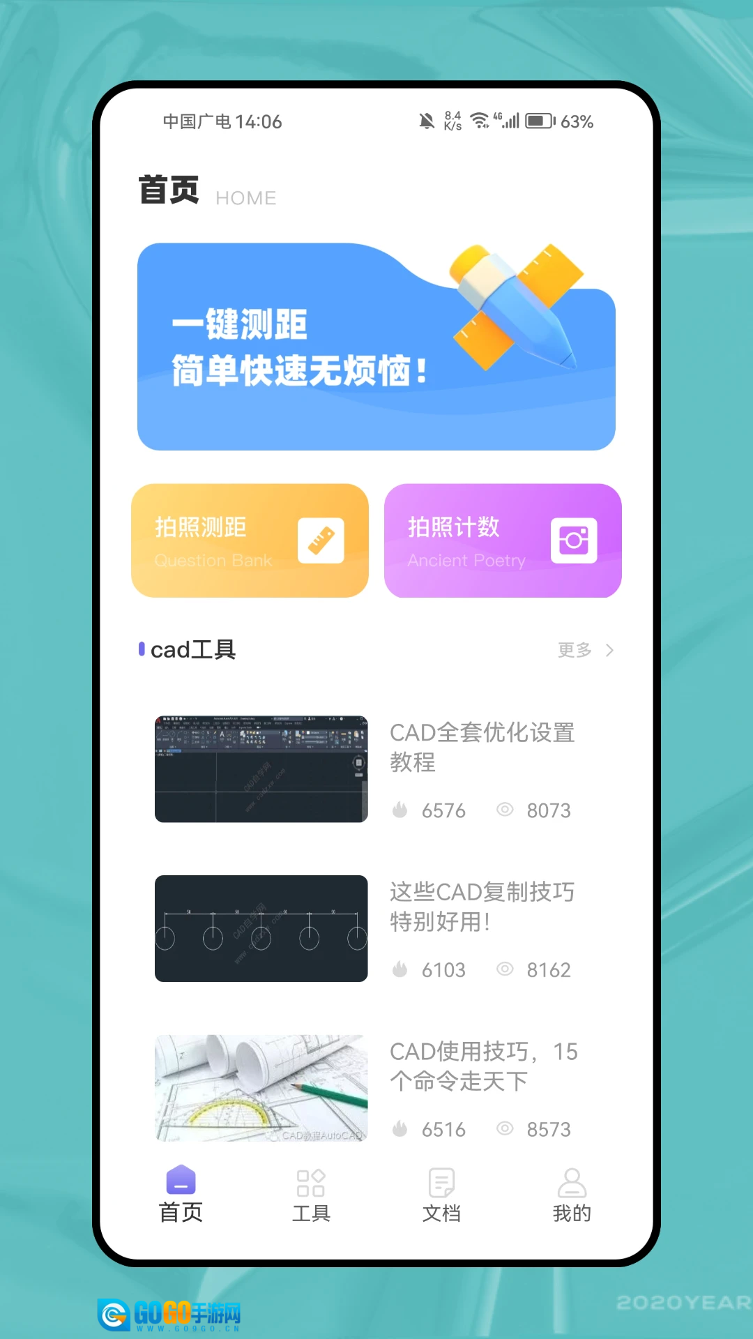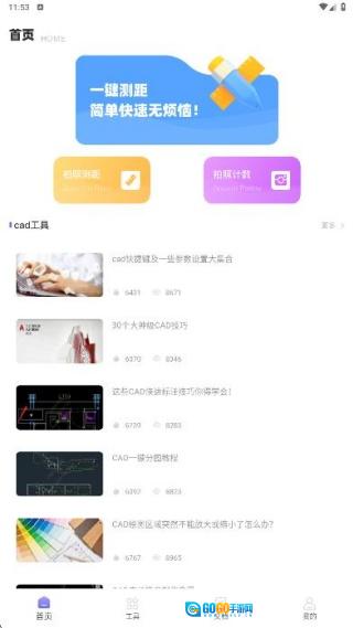 1、首页配备了拍照测距与计数功能,同时还提供cad工具的使用相关资讯。