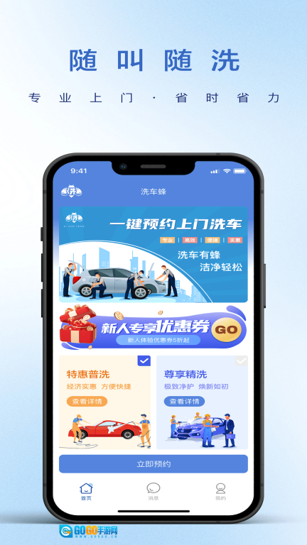 1、首页设有特惠普洗与尊享精选服务板块,用户可随时点击进行立即预约;