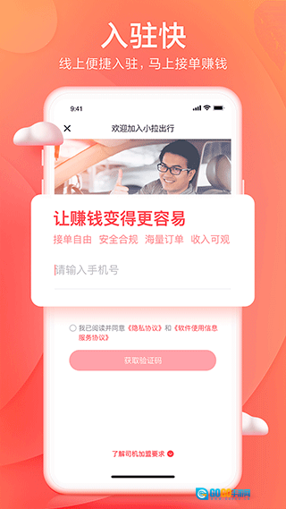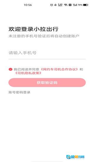 1、先安装小拉出行司机版应用,之后打开该应用,通过输入手机号完成登录与注册操作。