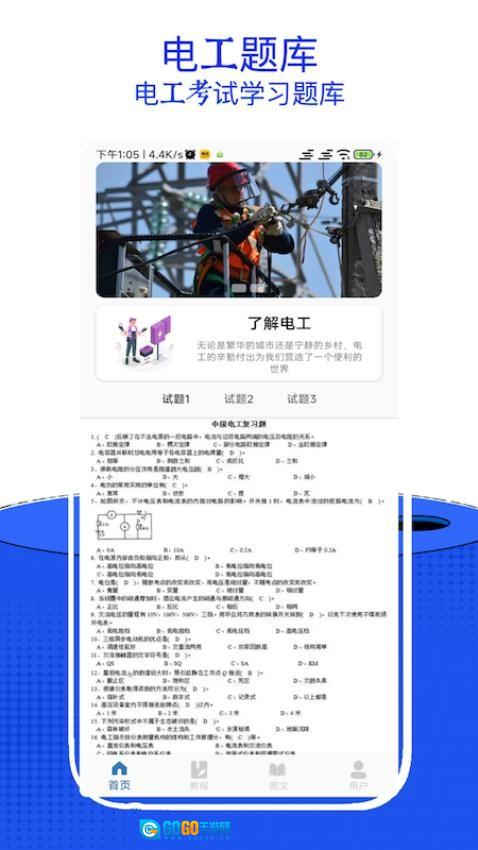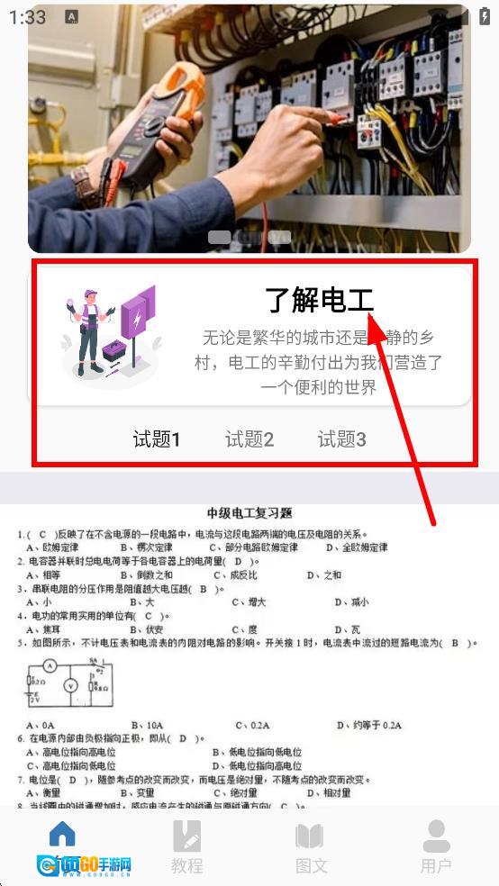 1、在首页可以查看并了解电工相关的介绍内容,还能进行试题1、试题2、试题3等习题的练习。