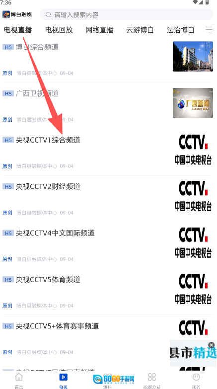 1、在底部导航栏找到“电视”图标并点击,进入电视直播频道列表页面。