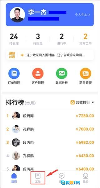 1、第一步:打开,进入首页,底部导航点击工单