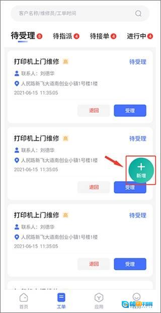 2、第二步:进入工单页面后,点击悬浮的新增按钮,就能跳转到添加工单的页面。