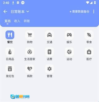 2、进入账单界面后,选择对应的收支类型,比如餐饮、购物、交通等类别。