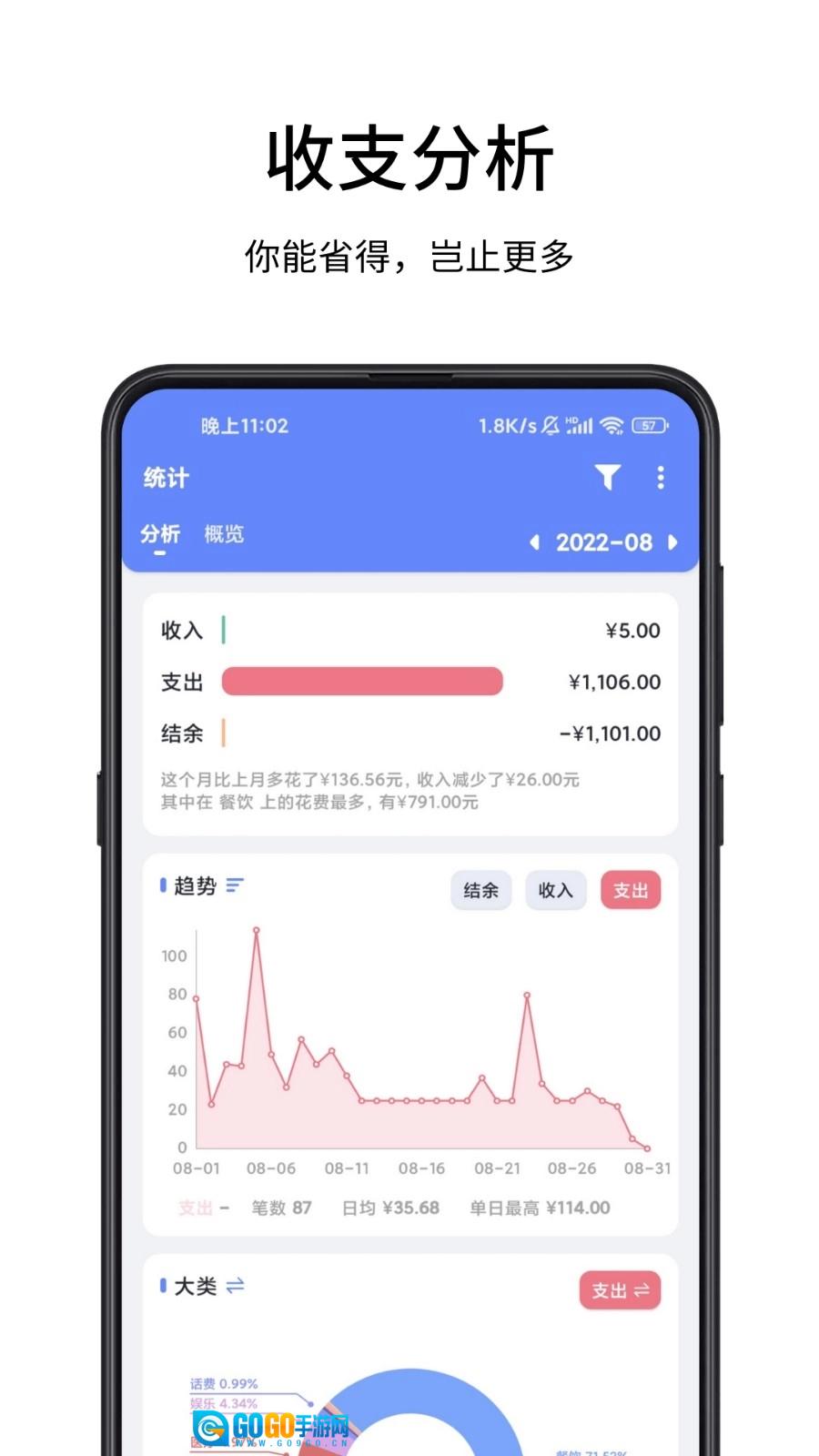 2、统计功能能够协助您对每天、每月、每年的收入、支出以及结余情况进行总结和归纳;
