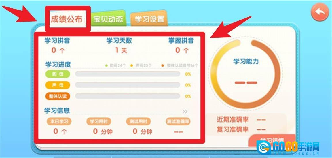 4、成绩公布板块会呈现学习天数、已掌握的拼音数量以及学习进度,家长能够直观地了解孩子的学习成果和能力变化情况。