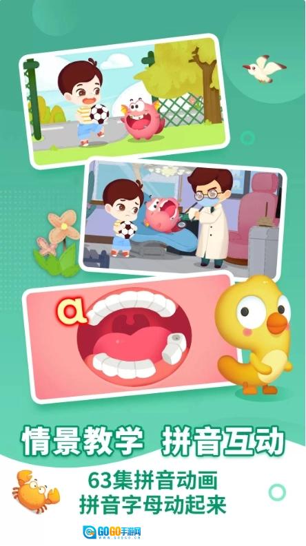 3、为孩子打造了63个原创拼音动画,通过动画直观呈现字母的字形特点。