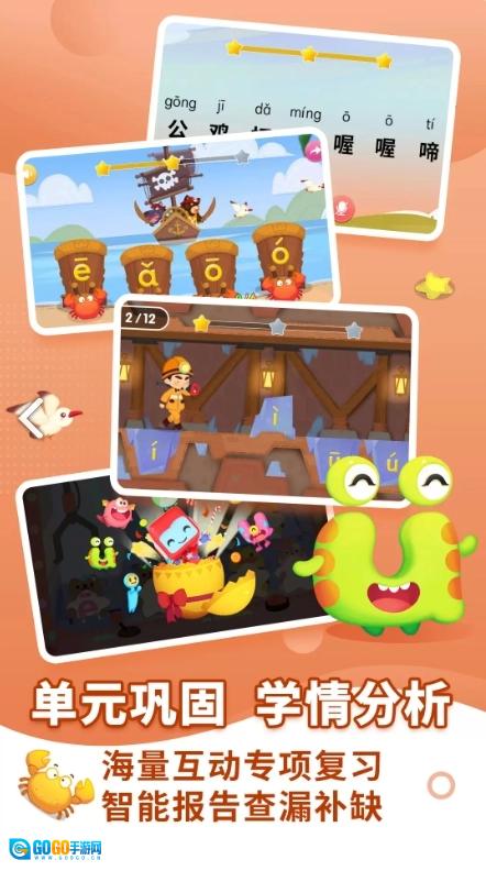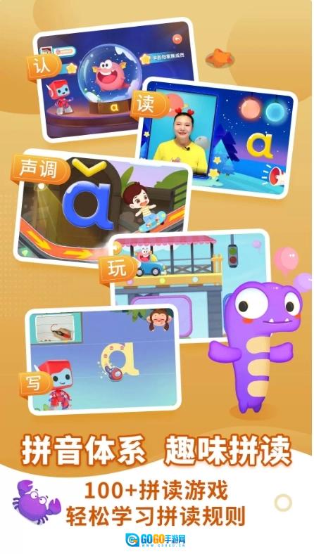 2、包含认、读、写、调、玩等多个板块,让拼音学习充满趣味;