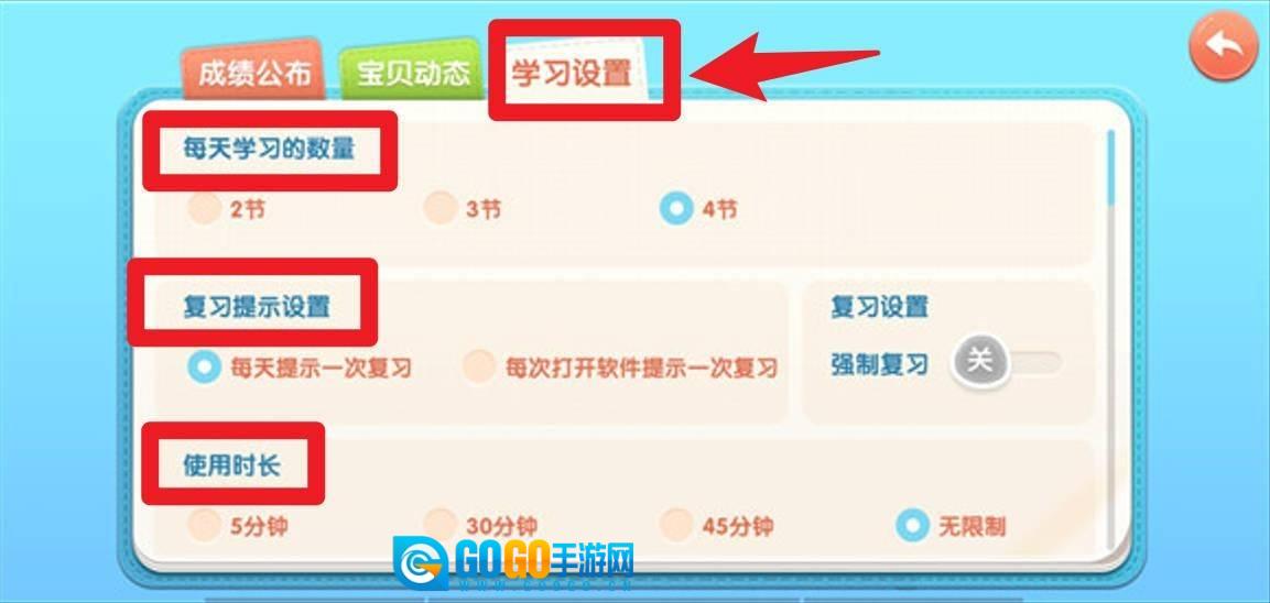 5、学习设置功能支持调整每日学习数量、复习提醒和使用时长,家长可根据孩子情况灵活配置,助力培养良好学习习惯。