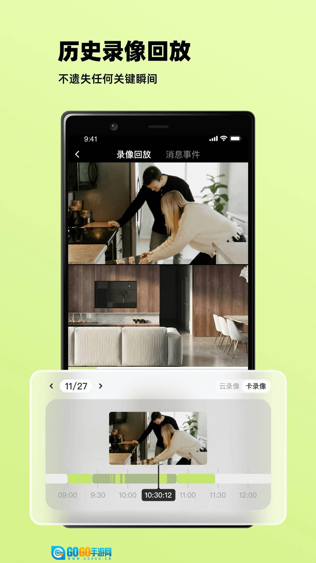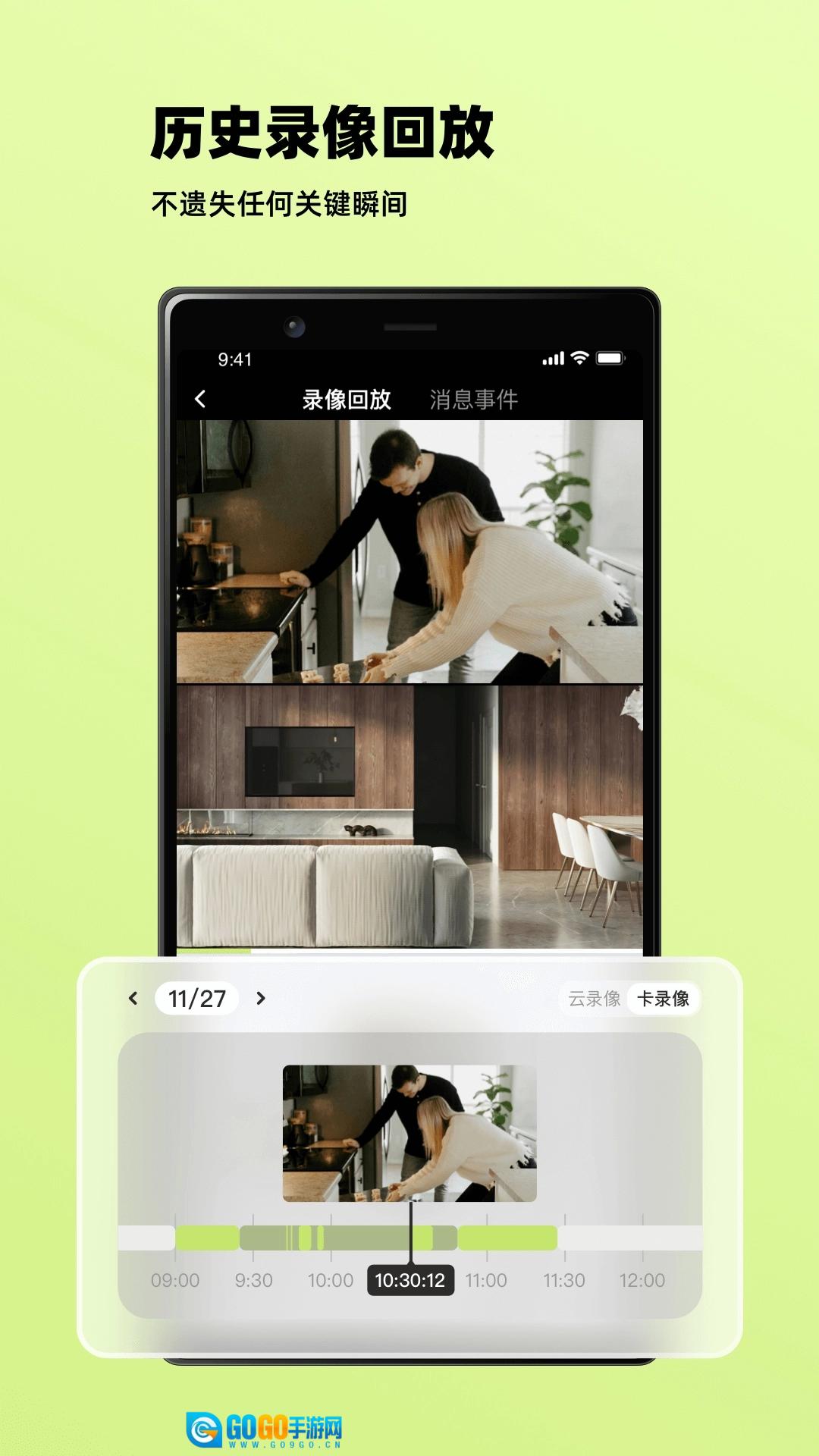 3、历史录像回放:支持按日期筛选查看录像,可通过拖动时间轴精准定位;能够在云录像和存储卡录像两种存储方式间切换查看。