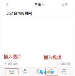 4、编辑日志内容,挑选好要上传的图片或视频,点击【发表】按钮就能完成操作。