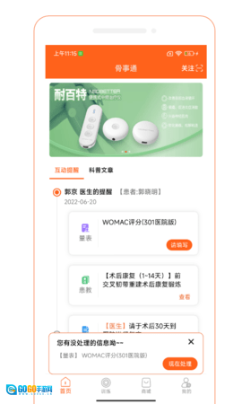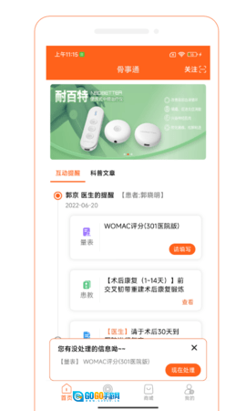骨事通是一款结合了可穿戴测量系统的医药咨询软件,主要用于协助骨科患者开展术后康复工作。该软件能够实时追踪康复进程,对康复动作进行专业的指导与纠正。同时,它还可以帮助医生为患者提供个性化、全方位且循序渐进的功能锻炼方案。