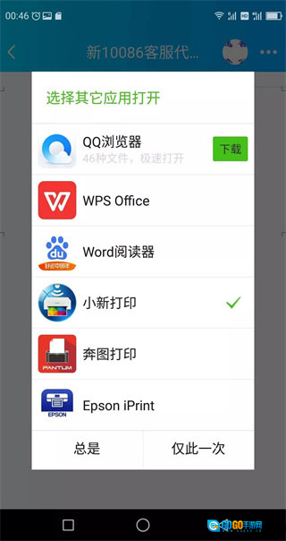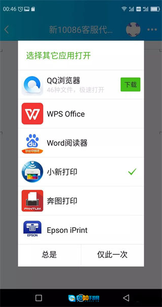 3、当软件与打印机成功连接后,我们就能打印微信或QQ里的文件了,操作方式很简单,只需在微信或QQ中找到收到的文件,然后选择“用其他应用打开”即可。