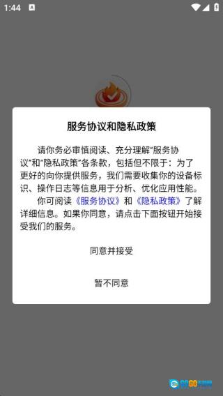 1、软件安装完成后启动进入,会弹出服务协议与隐私政策的提示,点击“同意”按钮即可。