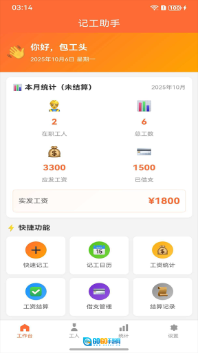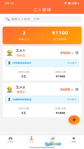 1、可以清晰直观地查看在职工人数量、日工资总和,以及工人的详细信息,这些内容都能一目了然地获取到。