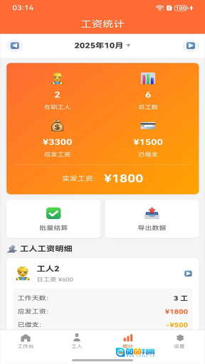 3、对一定周期内的总工数、应发工资、已借支等数据进行统计,可查看工人工资明细,并且支持批量结算与数据导出功能。