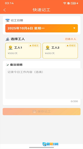 2、选定记工日期与对应的工人,补充备注信息,这样能更便捷地记录工人的工作状况。