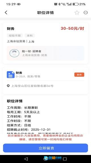 4、在线查看兼职详情,能即时咨询,还可向兼职信息发布人提交岗位申请。