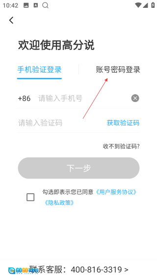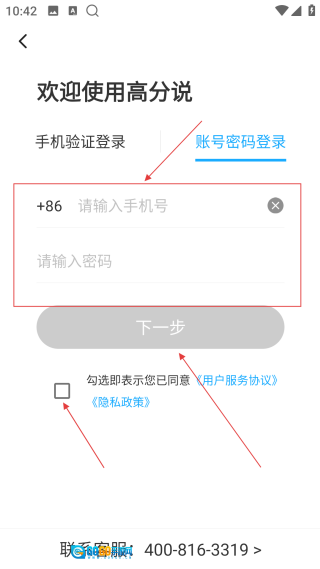 4、在账号密码登录页面完成信息输入并勾选相关协议后,点击【下一步】按钮就能完成登录操作。