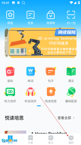 1、在学习页面,点击底部的【我的】按钮,即可进入个人中心页面,在那里可以查看各类学习功能。