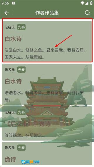 3、在作者作品集页面,点击目标古诗,即可进入其详情页面。