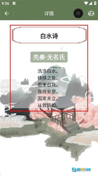 4、在古诗详情页面,既能查看白水诗的具体内容,也能切换拼音显示模式。