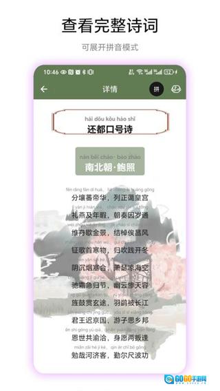 5、沉浸式学习场景:去除多余的干扰元素,通过清晰的排版结合拼音辅助功能,打造专注的阅读环境,使用户能够沉浸式地体会诗词的语言之美与文化底蕴。