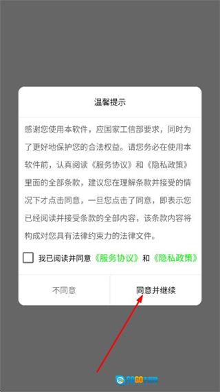 1、在温馨提示弹窗里,点击“同意并继续”按钮,即可进入古诗集页面。