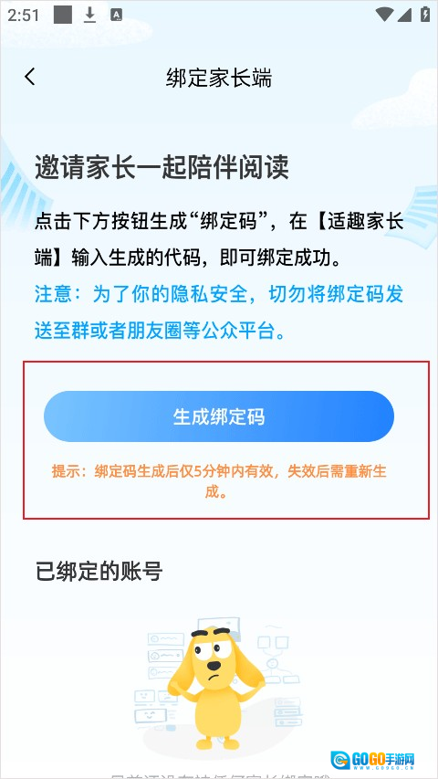3、最后选择生成绑定码,在家长端进行复制绑定即可