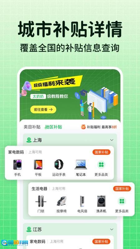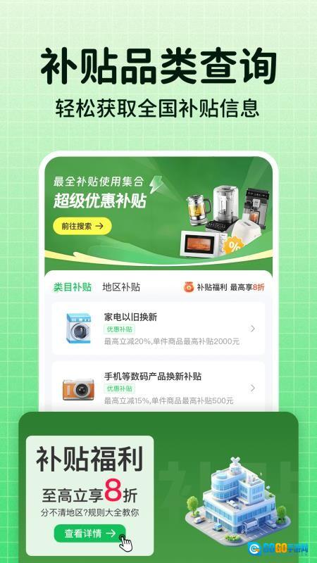 《一键国补查询》是一款专门用于补贴查询的软件,覆盖手机数码、货车报废、汽车置换等热门品类补贴,能够查询补贴须知、领取资格以及使用渠道,帮助用户掌握各地区补贴政策和使用方法,是补贴信息查询的实用工具。