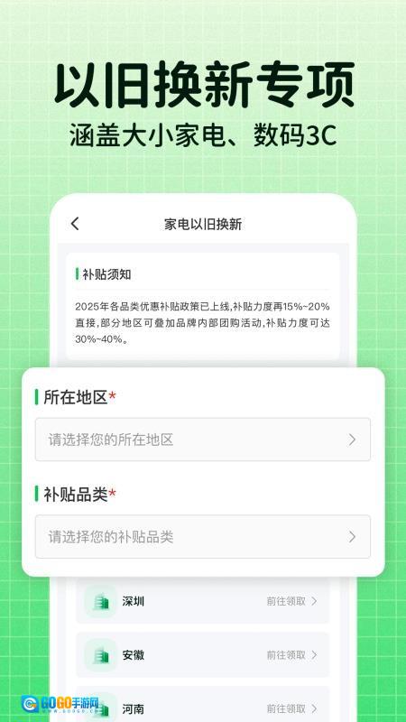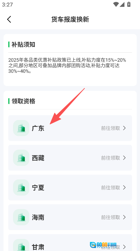 2、具备地区资格查询功能,用户可选择广东等地区,查看补贴领取资格,帮助用户明晰自身是否符合补贴领取条件。