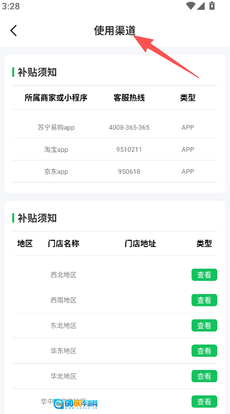 3、新增渠道查询功能,用户通过该功能可查看对应商家信息及客服热线等内容,便于清晰了解补贴的具体使用途径。