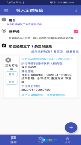 懒人定时短信是一款极易上手的通讯管理工具,不管您处于睡眠状态、忙于事务还是暂时离开手机,它都能帮您完成定时自动发送短信、微信与电子邮件的操作。该软件支持设置单个或多个定时规则,您可以针对每条规则进行编辑、禁用、启用、删除以及立即执行等操作,从而根据自身需求灵活管理各类定时任务。此外,为保障您的隐私安全,软件配备了安全锁功能,能够有效防止他人恶意查看或修改相关内容。