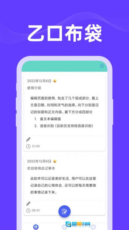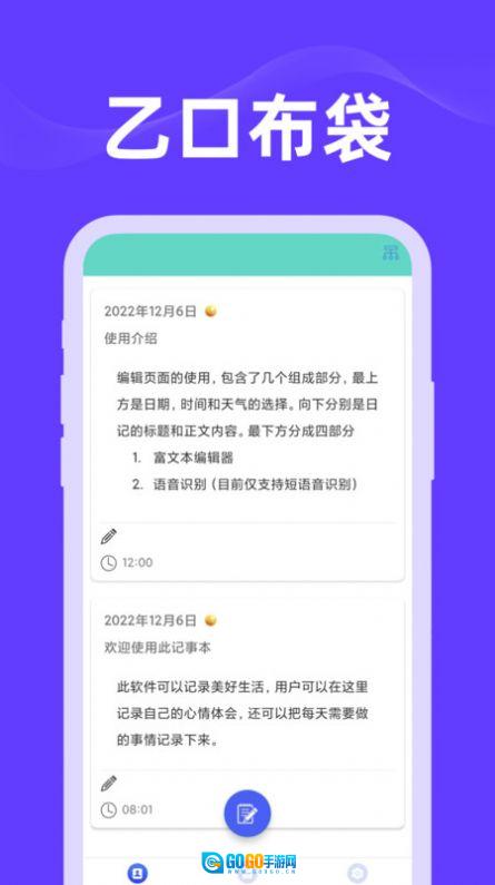 乙口布袋是一款相当出色的生活记录软件,它具备丰富多样的功能设计,能为用户提供更便捷的生活体验。用户可在此记录每日的重要事项,而且记录操作十分简单,支持多种记录方式,无论是写日记、记账等都能轻松实现。