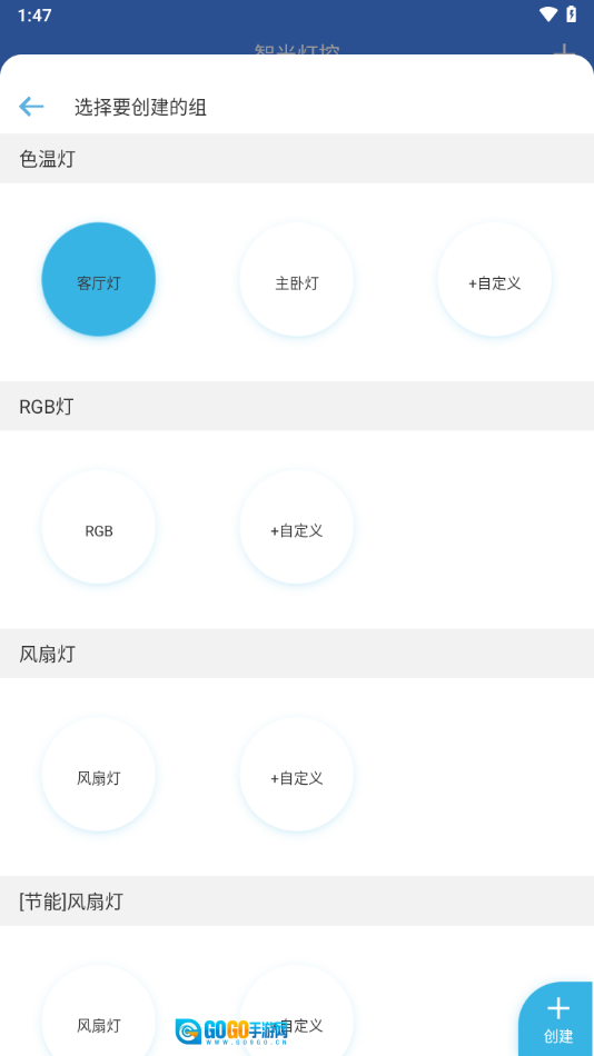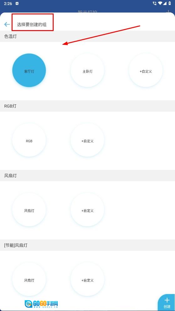 4、点击“创建组”选项后,能够选择想要创建的灯组,比如色温灯分类下的客厅灯、主卧灯等,还可以自定义灯组的类型。