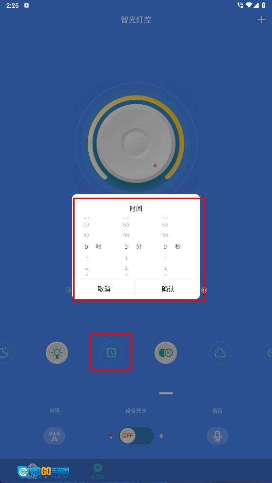 2、点击闹钟图标,能够设定灯光开启或关闭的时间,完成设置后点击【确认】按钮即可生效。