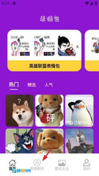 1、安装并打开软件后,首页陈列着各类丰富的表情包,点击界面下方的“表情制作”功能即可开始创作。