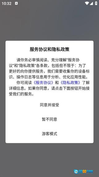 1、软件安装完成后打开进入,会弹出服务协议与隐私政策的确认窗口,点击“同意”按钮即可。