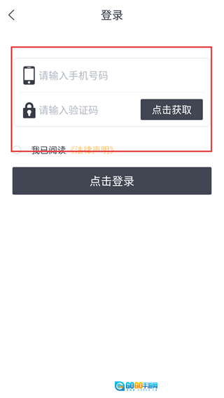 3、进入【登录】页面后,要在【请输入手机号码】的输入框中填写号码,接着点击【点击获取】按钮来获取验证码并填入,最后点击【点击登录】按钮就能完成登录操作。