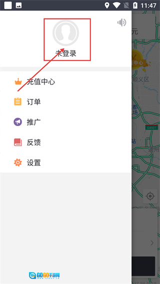 2、点击对应区域弹出的侧边栏中,会显示【未登录】的状态,同时还有【充值中心】、【订单】等功能选项,要使用这些功能需要先完成登录操作。