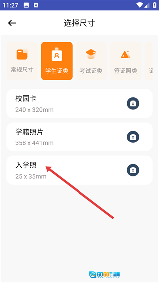 2、进入【选择尺寸】页面后,在【学生证类】的分类里找到【入学照-25×35mm】这个选项并点击,随后就会进入照片选择的环节。