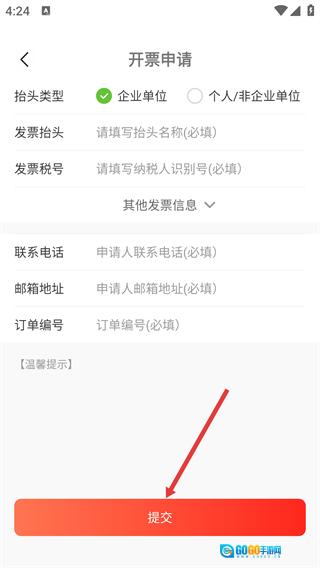 4、进入【开票申请】页面后,先选择对应的【抬头类型】,接着填写好所有带必填标识的信息,最后点击页面底部的【提交】按钮,即可完成开票申请操作。