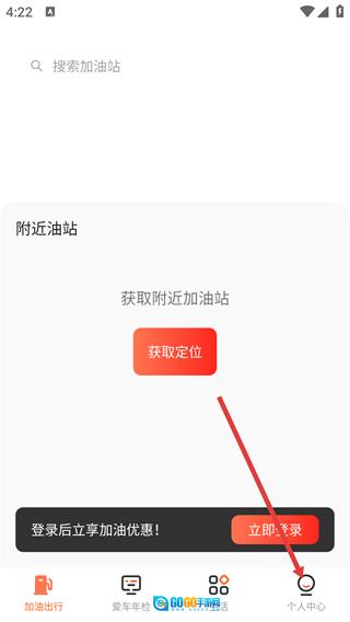 在软件主界面,点击【获取定位】即可查询周边加油站;若要进入对应的功能页面,可点击底部的【个人中心】按钮。