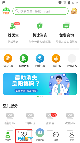 进入软件主界面后,既可以借助顶部的【搜索医生-疾病-药品】栏来查询相关信息,也能够点击底部的【健康管理】按钮,进入到对应的功能模块当中。