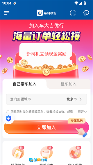 5、在首页选择自带车辆或租赁车辆加入平台,就能开启接单流程。