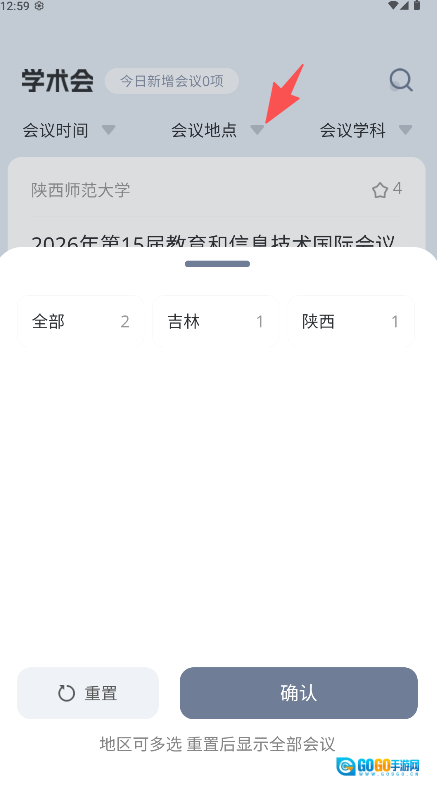 2、在首页找到“会议地点”筛选框,点击展开后进入地区选择界面。