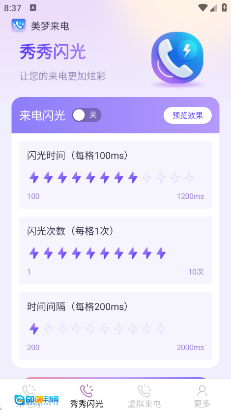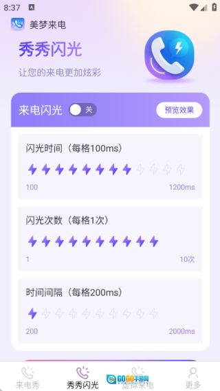 2、秀秀闪光功能支持自定义来电闪光灯特效,还能搭配动感节奏,即使在黑暗环境下也能让你快速识别重要来电。