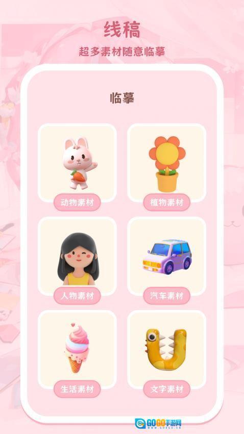 1、创意画板配备了100多款主题模板,包含动物、植物、交通工具等深受儿童喜爱的题材。