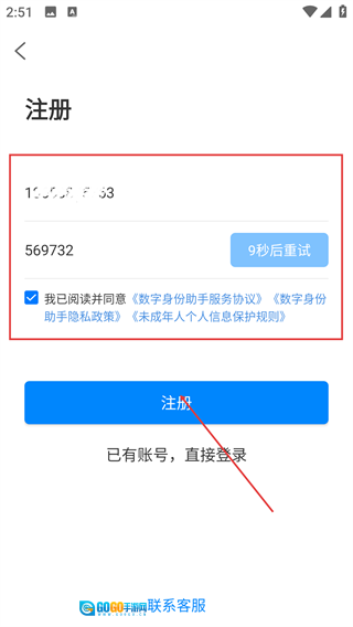 4、进入【注册】页面后,依次填写手机号码和验证码,勾选相关协议,最后点击蓝色的【注册】按钮,就能完成注册流程了。
